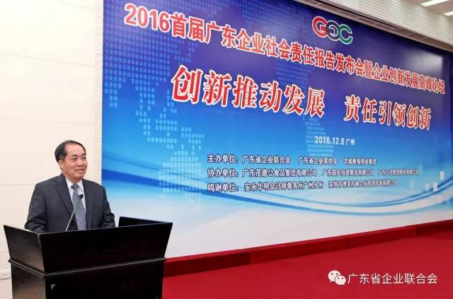2016年12月8日,由廣東省企業聯合會、廣東省企業家協會主辦的“2016首屆廣東企業社會責任報告發布會暨企業創新發展高峰論壇”在廣州珠島賓館隆重舉行。省人民政府原副省長、省人大常委會原副主任,省企業聯合會、省企業家協會原會長鐘啟權,省人大原常委,省企業聯合會、省企業家協會原常務副會長梁燦盛、省總工會副主席郭開農、省企業聯合會、省企業家協會執行會長劉鎮河、省企業聯合會、省企業家協會執行副會長孟云娟、省科技廳調研員李承偉,省企業聯合會、省企業家協會秘書長張峰和來自全省各地的企業家和企業代表約260多人出席了發布會。會議由孟云娟主持。