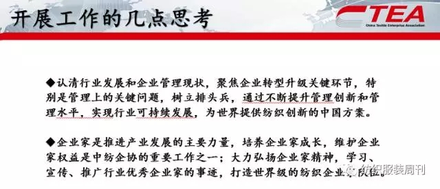 楊峻說,中紡企協(xié)一直以為企業(yè)和企業(yè)家服務(wù)為宗旨,圍繞著改革和管理兩大中心任務(wù),把協(xié)會辦成企業(yè)和企業(yè)之間的紐帶、企業(yè)和政府之間的橋梁。未來將發(fā)揮中紡企協(xié)“三位一體”的資源聚合優(yōu)勢,按照“一體兩翼”工作思路,打造行業(yè)話語權(quán)提升的重要平臺和輿論高地;國內(nèi)外紡織行業(yè)資源互動與整合平臺;行業(yè)轉(zhuǎn)型升級、創(chuàng)新發(fā)展的公共服務(wù)平臺;企業(yè)社會責(zé)任的重要實施平臺;國際一流企業(yè)家成長平臺與騰飛搖籃。