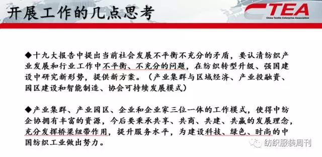 首先,深入調(diào)查研究,加強信息共享。以中紡聯(lián)2017春季大調(diào)研為起點,中紡企協(xié)圍繞行業(yè)發(fā)展形勢和企業(yè)需求,以及企業(yè)運行和管理、集群升級、園區(qū)建設(shè)等展開調(diào)查研究工作,全年考察調(diào)研覆蓋全國主要紡織地區(qū)集群和園區(qū)以及重點企業(yè)。