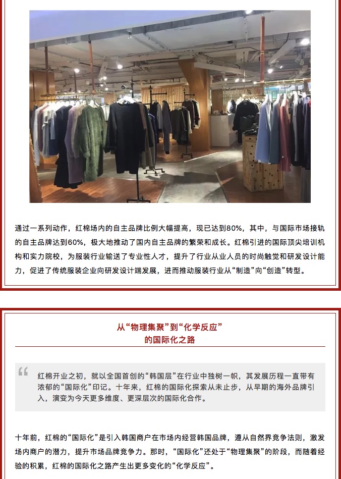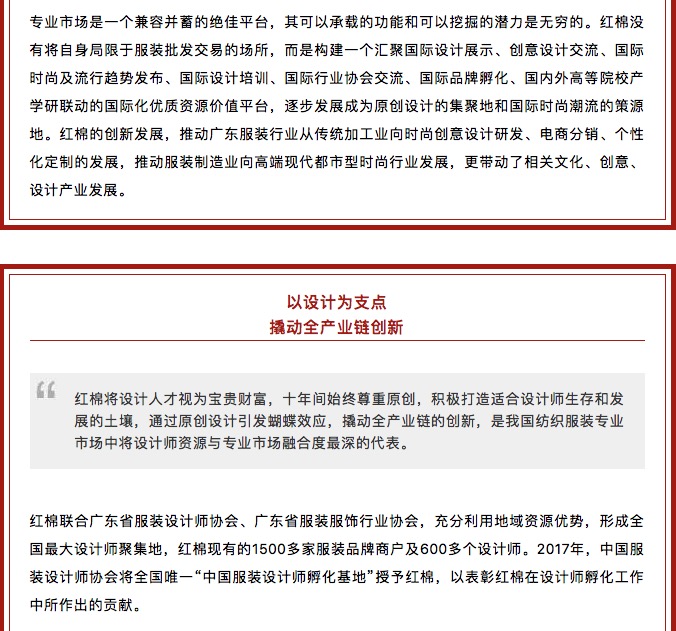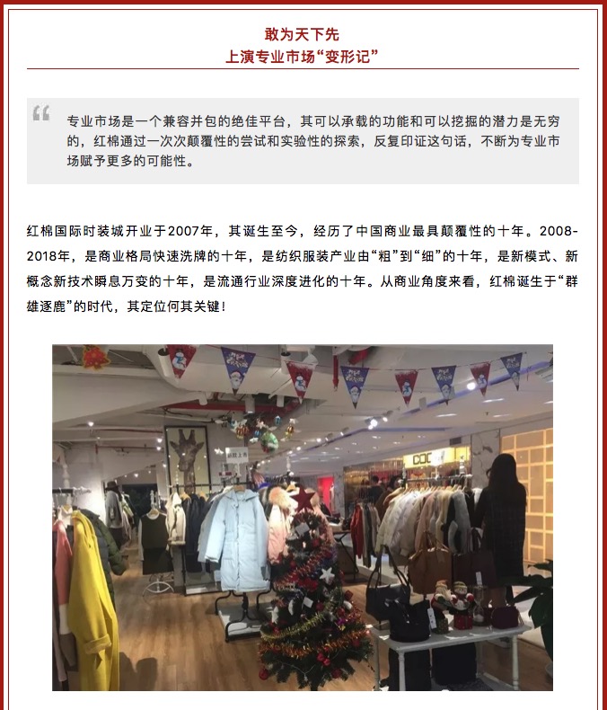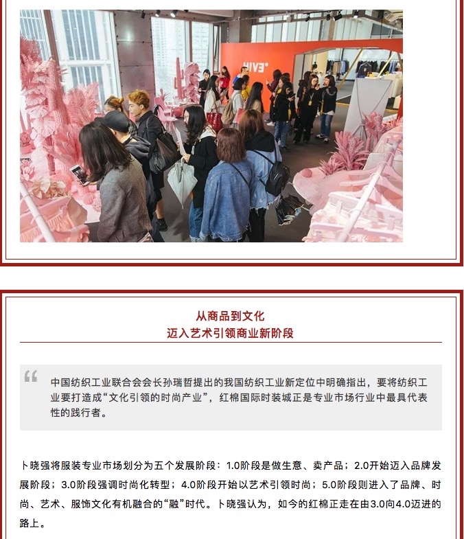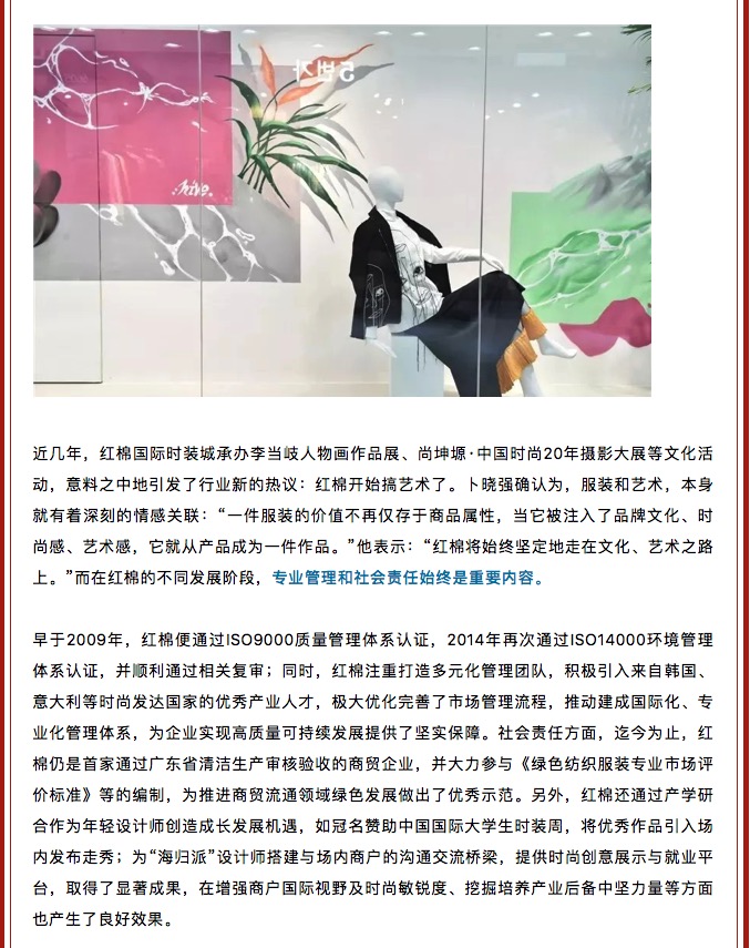 開業初期,紅棉是全國最早開始談論“時尚”的紡織服裝專業市場之一。新時代下,全國紡織服裝專業市場幾乎都在談“時尚”,而紅棉仍是其中最特別的一個。當大部分市場談論時尚,他們談論的是服裝的款式、門店的裝修、市場的環境,當紅棉談論時尚,他談論的是如何讓“時尚”成為時尚。或許這樣定義紅棉的“時尚性”更為恰當:與其跟隨時尚,紅棉更愿意創造時尚,所謂“時尚引領”當如是。十年間,紅棉以自身市場為平臺,不斷在行業內掀起新潮流,首創新模式,引發新思考,在紡織服裝流通領域中,不斷賦予專業市場新的價值,走出了一條與傳統服裝批發市場差異化升級發展的新道路。