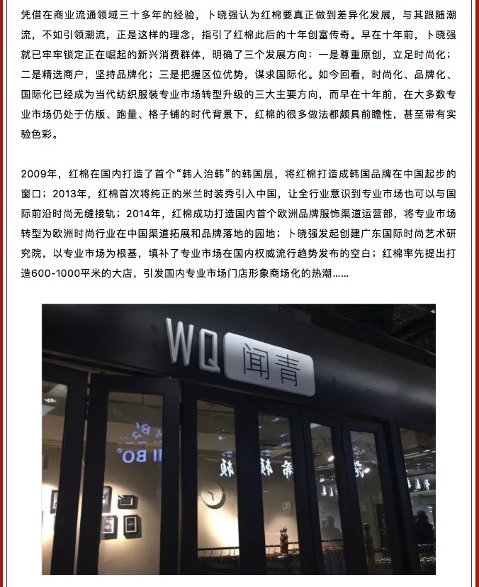 在我國數以千計的紡織服裝專業市場中,紅棉國際時裝城似乎很難被歸類,也很難被定義,因為紅棉時常做出超越專業市場傳統職能范疇的驚人嘗試。紅棉像個自成一派的世外高人,以獨樹一幟的心法苦練內功,以專業市場之姿,踏出一條原本不屬于專業市場的路。正如紅棉國際時裝城總經理卜曉強所說的:“從1984年進入商業流通領域工作及專業市場行業,我就不是為某個特定的品牌服務,而是為整個產業服務。”紅棉所做的,正是在紡織服裝產業乃至整個商業大環境中,為專業市場挖掘更多的可能性,賦予新的價值。