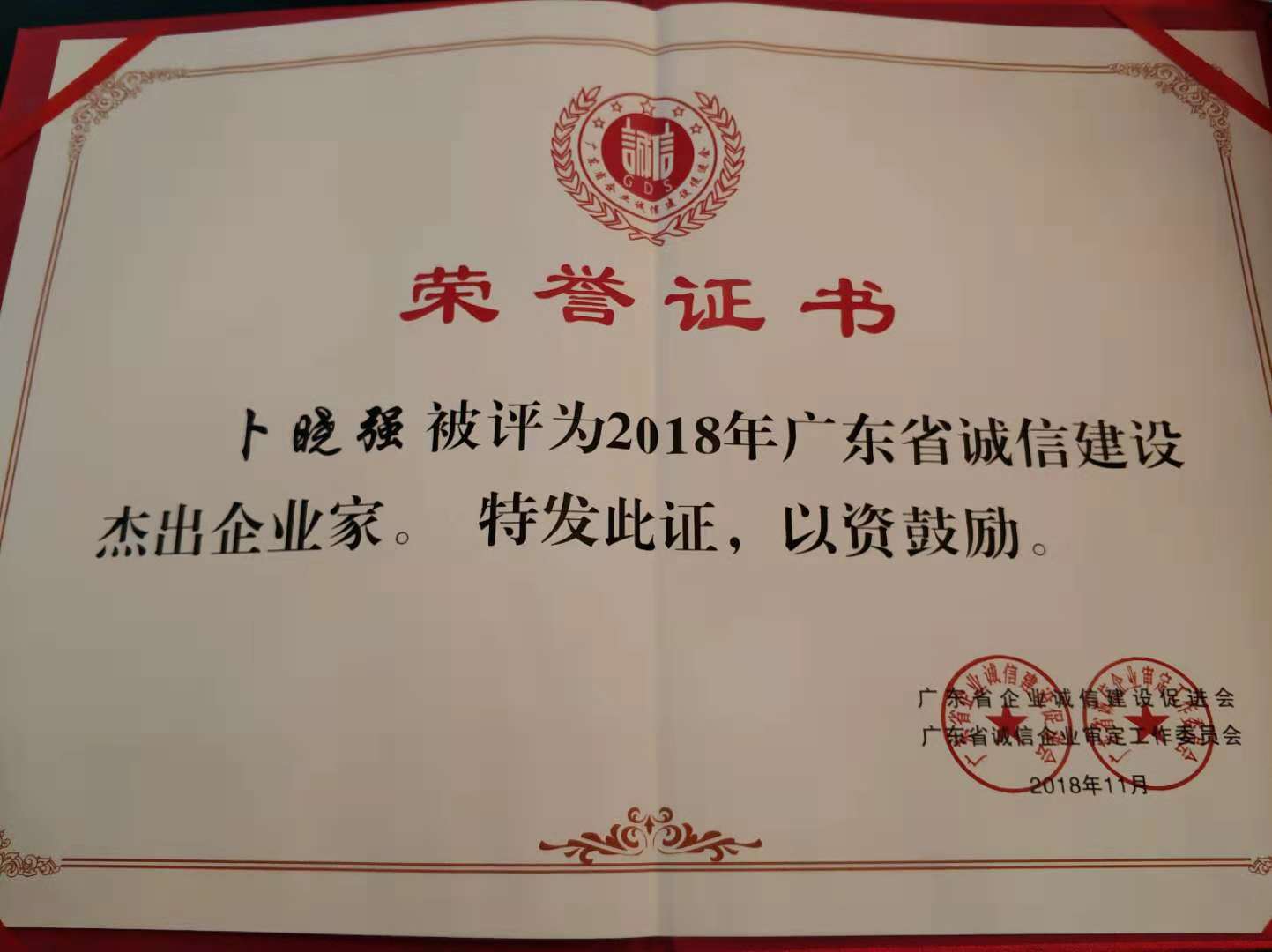 卜曉強被評為2018年廣東省誠信建設杰出企業家。