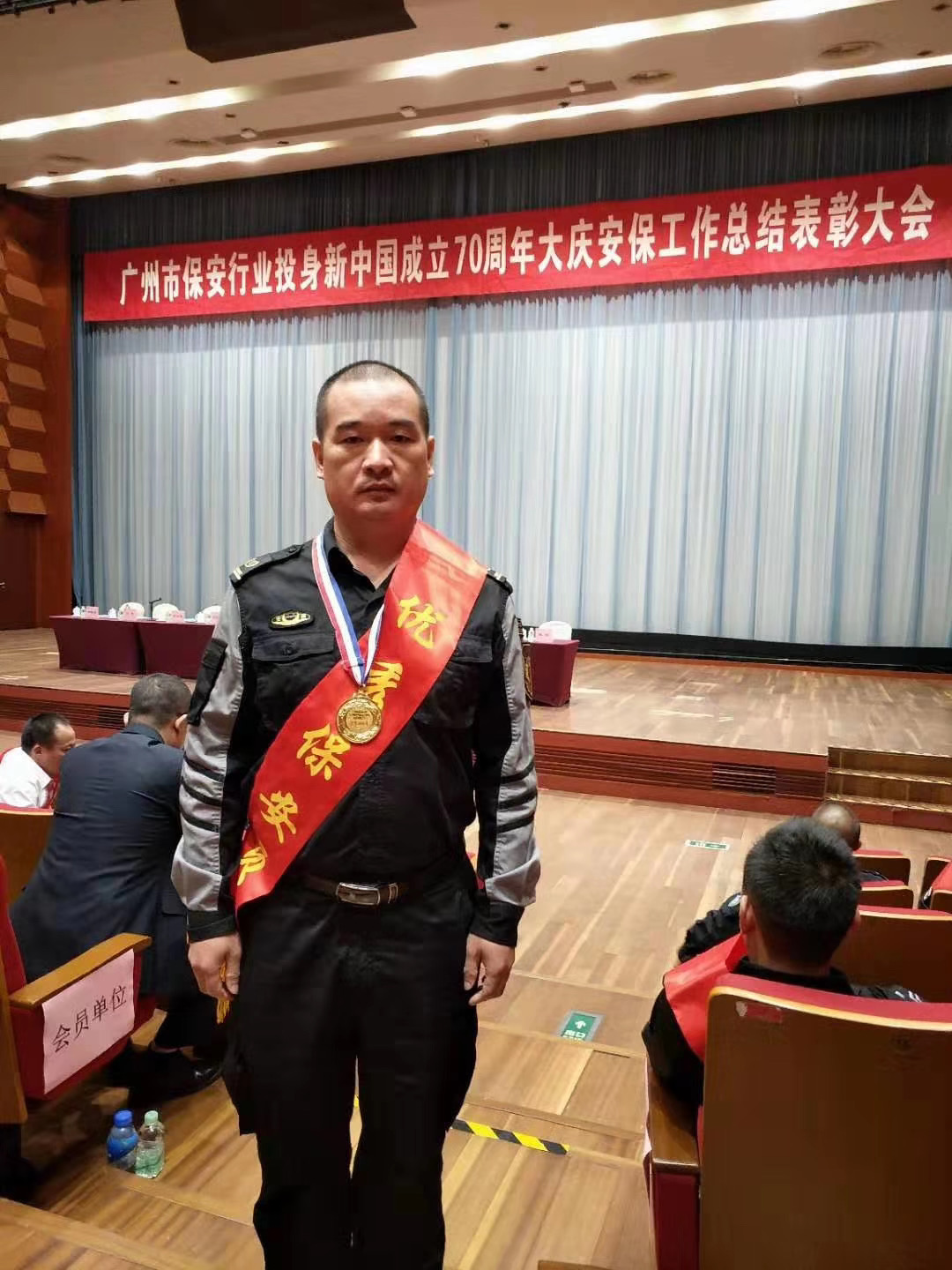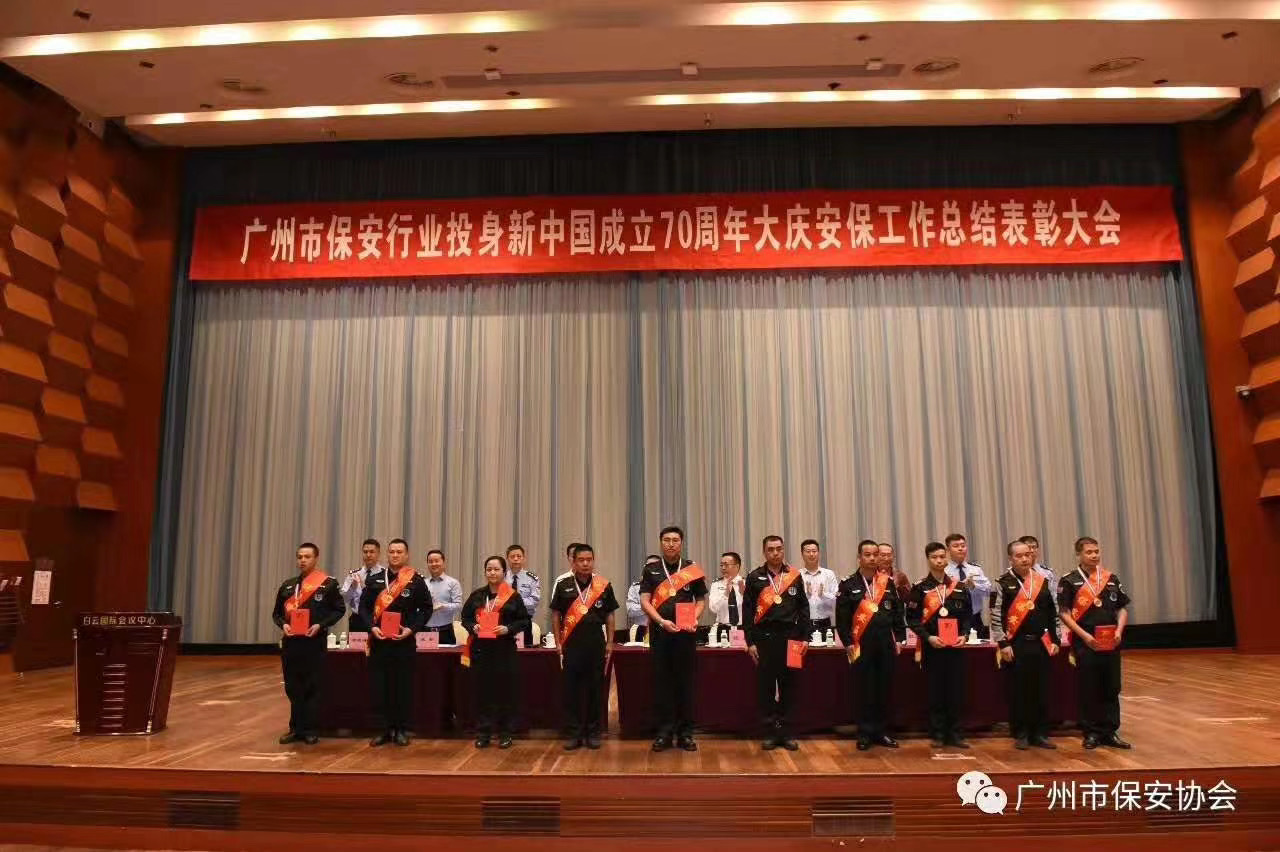 廣州市保安行業投身新中國成立70周年大慶安保工作總結表彰大會,圓滿成功。祝賀紅棉國際時裝城保安部唐小河,被評選為2019年度優秀保安員。